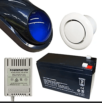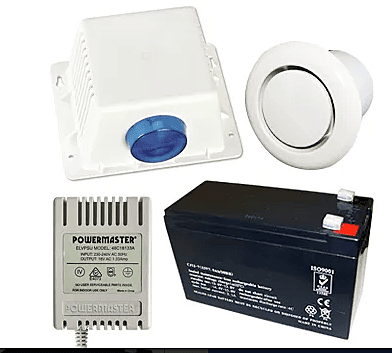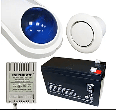 Alarm accessory bundle, includes Slimline Style WHITE Cover, Siren/Horn, Strobe & Tamper switch (WP06), 12V 7AH Battery, 18V AC 1.33A plug pack, Flush Mount screamer