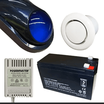 Alarm accessory bundle, includes Slimline Style BLACK Cover, Siren/Horn, Strobe & Tamper switch (WP06), 12V 7AH Battery, 18V AC 1.33A plug pack, Flush Mount screamer